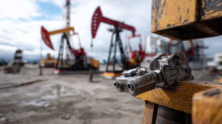 This image captures a close-up of machinery with an oil pump in the background, showcasing industrial processes in oil extraction. The cloudy sky adds depth to the scene.