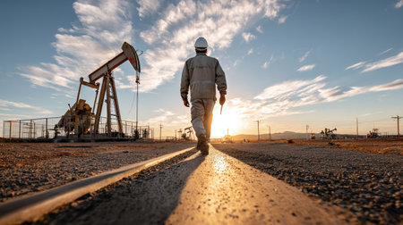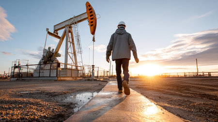 A worker in safety gear stands against the backdrop of an oil pump jack at sunset, capturing the essence of industrial energy production in a serene landscape.