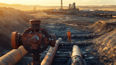 A worker in a safety helmet watches oil pumping machinery during sunrise on an expansive industrial site. The scene captures energy exploration and technological advancement.