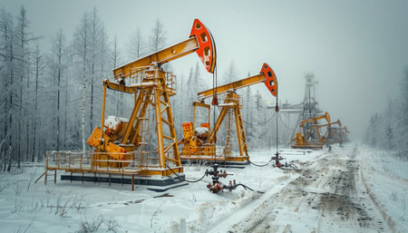 A row of engineering machines extracting oil sits stoically in the snowy landscape, contrasting with the serene white surroundings