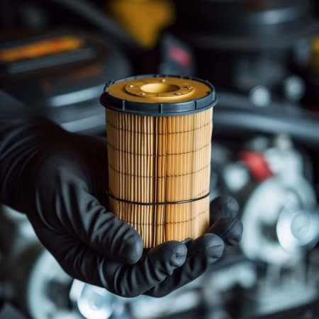 Mechanic in black gloves demonstrates the importance of timely diesel engine oil filter replacement
