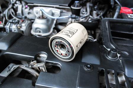 Oil filter cartridge of car on engine bay. Automotive part, engine care.