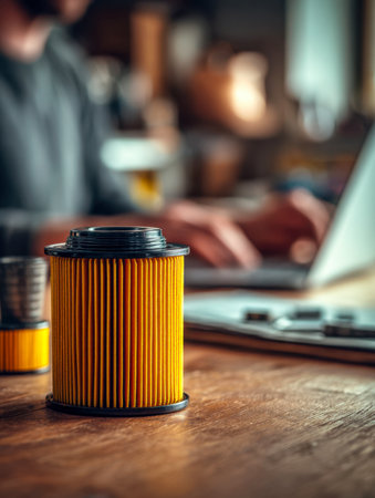 A sturdy metal oil filtration component placed on a rustic wooden surface, with a softly focused figure typing on a laptop nearby in cozy indoor lighting.