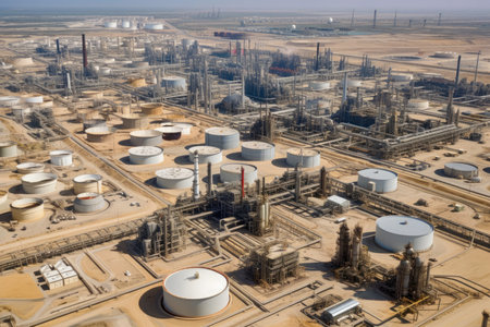 Highly detailed aerial view of a sprawling oil refinery complex, with pipelines, storage tanks, and industrial buildings, AI Generated