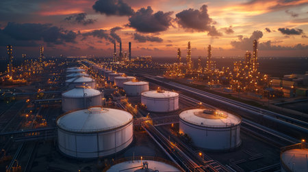 Captivating aerial view showcasing industrial oil storage tanks and refineries during sunset, highlighting the interplay of lights and landscape.