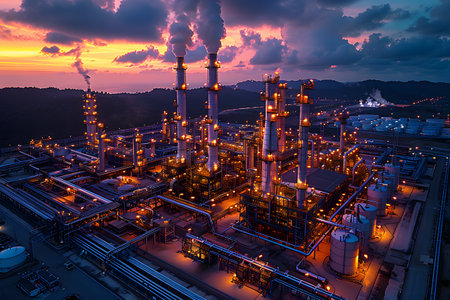 Industrial Landscape: Oil Refinery at Sunset with Complex Pipeline System