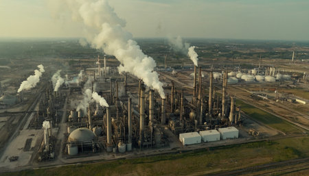 An aerial view of a large industrial plant showcasing smokestacks and machinery. The image captures the dynamic nature of energy production and its impact on the environment.