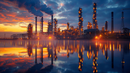 A breathtaking sunrise illuminates an oil refinery against a colorful sky, highlighting industrial silhouettes, vibrant reflections on water, and dynamic smoke.