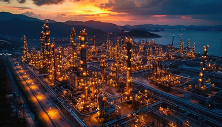 Captivating aerial view of a vast oil refinery at sunset, blending into the natural landscape with clouds drifting in the sky and water reflecting the dusky horizon