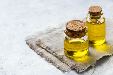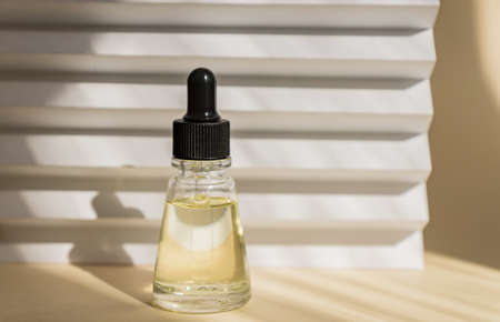 Serum or essential oil bottle on light background. Natural organic cosmetic