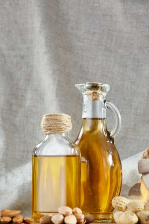 Bottles of cooking oil - sunflower olive and sesame oil with seeds.