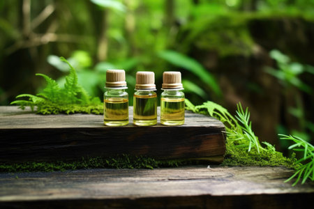 essential oil bottles on wooden steps in a forest, created with generative ai