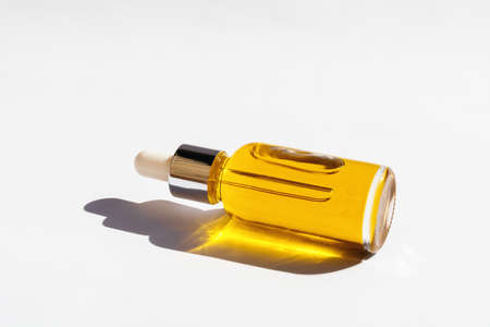 Dropper glass Bottle Mock-Up with metal lid and yellow essential oil lying on white background. Eco-cream, serum, cosmetics, massage oil. Natural light, beautiful orange sun shadows. Copy Space