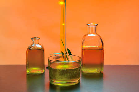 Closeup of laboratory glassware filled with orange and brown oily liquids, science and research background, selective focus