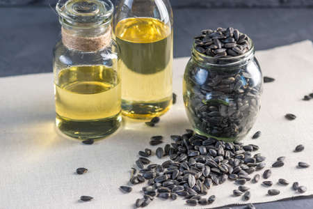 Sunflower seeds in a pile and golden oil in a glass bottle on the table. Concept healthy diet with vegetable fats.