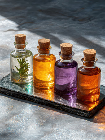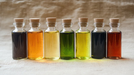 A vibrant collection of assorted glass bottles filled with natural oils of various colors, ideal for wellness, aromatherapy, and decorative uses.