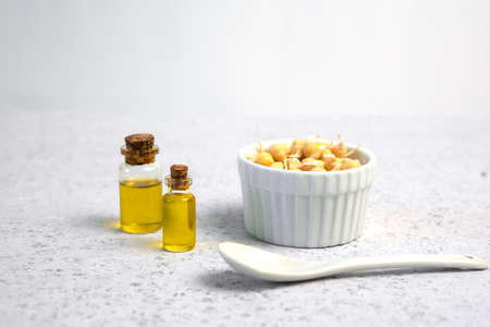 Aromatic oil in a glass jar and bottle with pistachio in bowl on wooden table, close-up