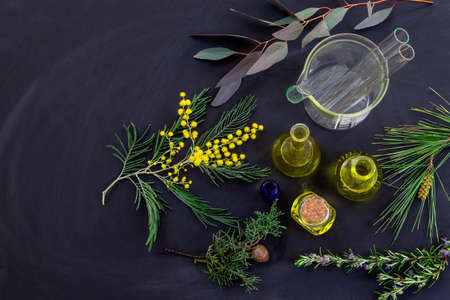 ethereal and cosmetic mvsla in glass bottles on a ceramic plate with slices of lemon and yellow flowers. alternative medicine