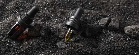 Essential oil for aromatherapy and mineral diffuser with volcanic stones on black sand background. Aromatherapy, spa, beauty treatment and wellness concept.