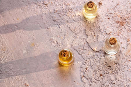 Yellow oil serum essence in glass bottle flatly. Concept of natural cosmetic, trendy beauty skin care. Sunscreen oil to protect the face body at summer days. Sea theme, seashells, stones, pink sand.