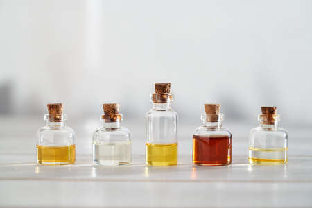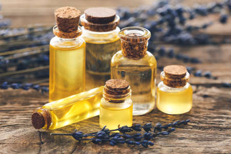 Lavender essential oil in a little bottles on wooden background. Aromatherapy tools, bottles with oil and lavender flowers.