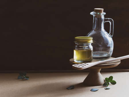On the table are two glass bottles filled with spicy and rosemary olive oil. Butter for pizza, rest in an Italian restaurant. Close-up