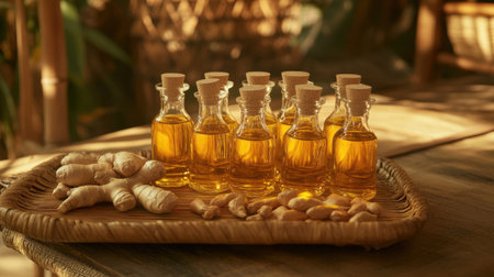 A stunning arrangement of glass bottles filled with golden liquid, basking in soft sunlight that enhances the warm mood of the setting. Ideal for wellness or culinary themes.