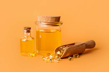 Liquid yellow retinol cosmetic serum or vitamin C gel or essential oil on petri dish close up.