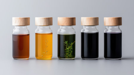 A series of glass vials containing liquids in different colors are arranged neatly. Each vial showcases a unique shade, creating an appealing visual display.