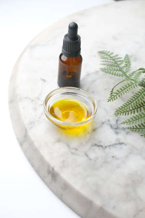 Pipette from dropper with essential oil lies in the petri dish with cosmetics serum. Top view liquid cosmetic. Herbs natural ingredients.