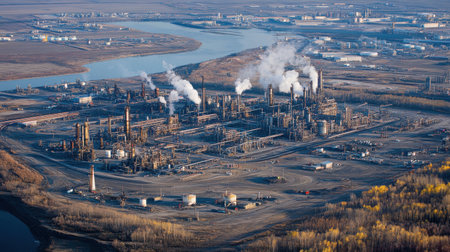 Wide shot of an industrial area with oil refineries and chemical plants, highlighting the expansive infrastructure and operations with this inviting photo.