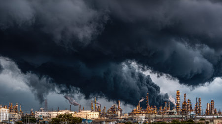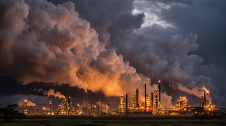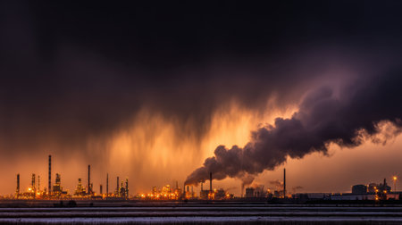 A dramatic scene depicting an industrial complex under dark storm clouds, showcasing machinery, emissions, and atmospheric pollution in a twilight setting.