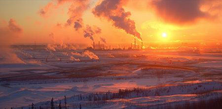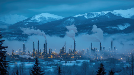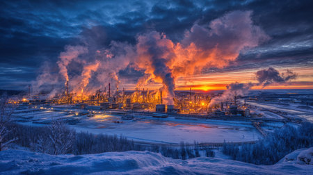 A striking industrial scene depicting oil rigs and smokestacks amidst a winter landscape, showcasing the stark contrast between nature and energy production.