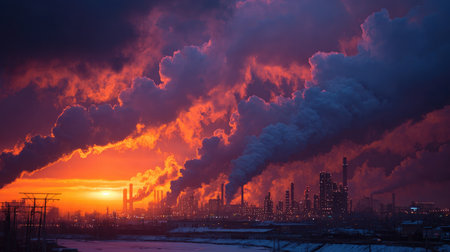 This captivating image captures an industrial skyline at dusk, with towering factories emitting smoke against a backdrop of dramatic clouds, highlighting energy production.