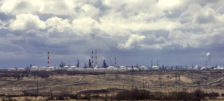 Oil refinery at twilight with smoke in the air. Oil and gas industry