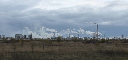 Sunset over the industrial city.Factory chimneys smoke.Environmental problem of environmental and atmospheric pollution.Climate change, environmental disaster.The sky is smoky with toxic substances