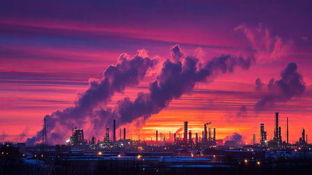 A breathtaking industrial landscape features a silhouette of an oil refinery with smoke rising into the dusky sky. The colors of the sunset create a dramatic backdrop, highlighting the intricate details of the factories and their smokestacks.