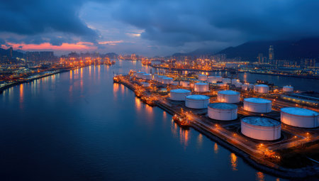 Aerial view of industrial harbor at twilight, featuring glowing storage tanks and vessels, with a stunning skyline and mountains creating a serene atmosphere