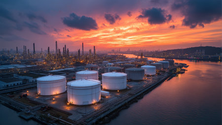 This aerial image captures an industrial complex at sunset, showcasing oil storage tanks, a refinery, and city lights in the background, highlighting urban development.