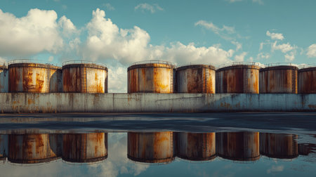 A striking image of rusty industrial storage tanks reflected in calm water, showcasing urban decay and environmental impact under a serene blue sky with fluffy clouds.