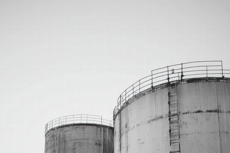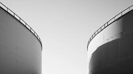 Two large oil storage tanks stand tall in an industrial setting, creating a contrast against a bright sky, with sharp lines defining their shapes.