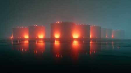 Illuminated storage tanks appear through fog, casting a warm glow on still waters at night, creating an atmospheric and serene scene.