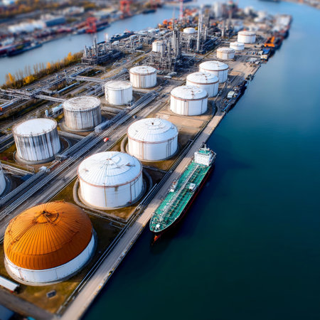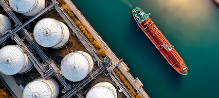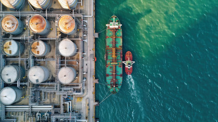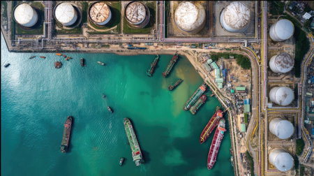 Aerial View of Oil Refinery with Storage Tanks and Docked Tanker. Captures global energy logistics