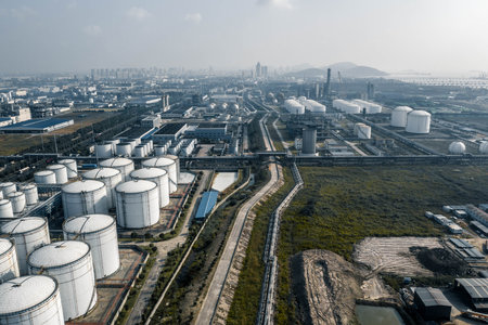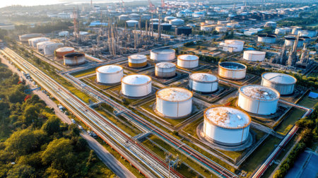 Generative AI Aerial view of a petrol chemical processing plant and storage facilities.