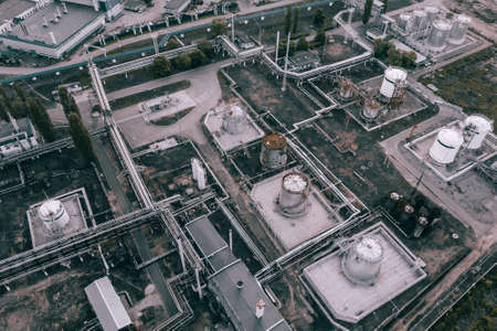 Dark industrial landscape background from above. Petrochemical factory with pipelines and steel tanks, aerial view.