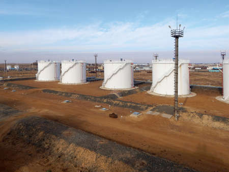 Cloudy day. Tanks with oil for further transportation of oil through pipes at an oil refinery and oil pumping station