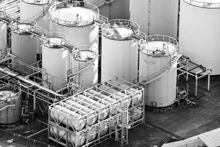 Oil refinery; tank farm storage chemical petroleum petrochemical refinery product at oil storage terminal company. Business commercial trade fuel and gas power and energy transport.