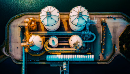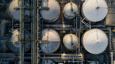 Dive into the heart of industrial operations with this detailed aerial view of a facility featuring large storage tanks and intricate machinery at night.