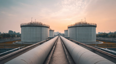 A modern treatment plant showcasing large storage tanks and extensive pipelines under a serene sunset sky, emphasizing industrial architecture and filtration technology.