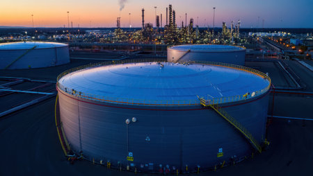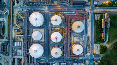 An overhead view of a modern oil storage facility showcases large tanks and complex equipment, highlighting industrial processes and environmental considerations in twilight.